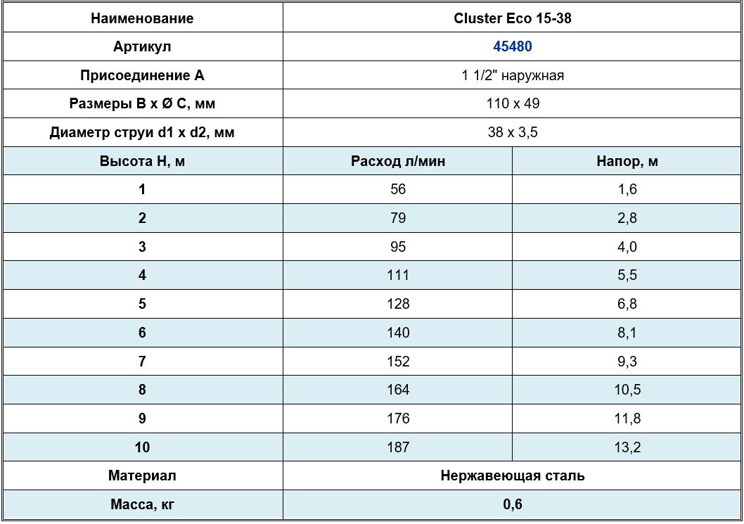 Cluster Eco из нескольких струй (21 шт.) формирует одну полную, диаметром 38 мм. Насадка предназначена для использования в бассейнах и в пресной воде, также подходит для установки в пешеходных фонтанах. Эта модель экономичнее по сравнению с обычными насадками, так как потребляет меньше воды.